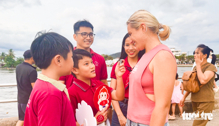 Giao tiếp với khách quốc tế, học sinh trên đảo không chỉ nâng cao kỹ năng mà còn hướng đến quảng bá hình ảnh du lịch Phú Quốc – Ảnh: XUÂN MI
