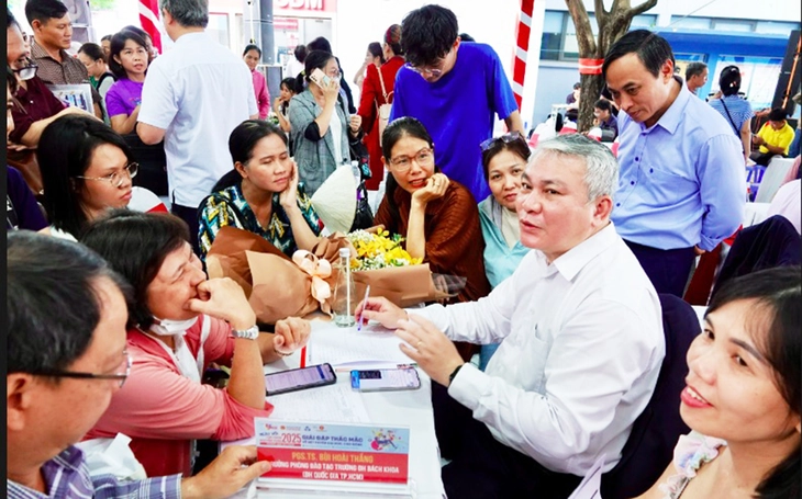 PGS.TS Bùi Hoài Thắng – trưởng phòng đào tạo Trường đại học Bách khoa, Đại học Quốc gia TP.HCM – trả lời thắc mắc của phụ huynh, học sinh về quy chế xét tuyển đại học tại ngày hội lựa chọn nguyện vọng xét tuyển 2025 – Ảnh: T.T.D.