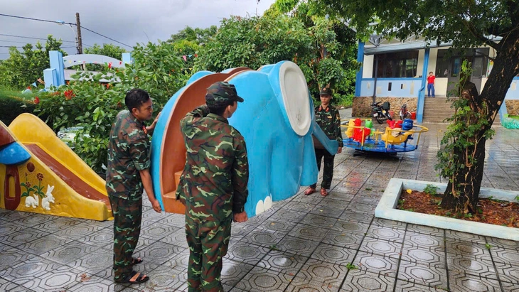 Nhiều trường tại Quảng Trị đã triển khai phòng chống bão với sự hỗ trợ của lực lượng quân đội – Ảnh: QUỐC NAM