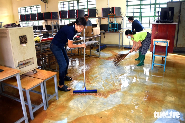 Trong buổi sáng, tất cả giáo viên, nhân viên của nhà trường được huy động đến trường để bơm nước rửa sân trường, dọn dẹp, quét bùn ở các lớp học của trường. Nước rút đến đâu, giáo viên quét dọn đến đó để học sinh buổi chiều vào lớp học.