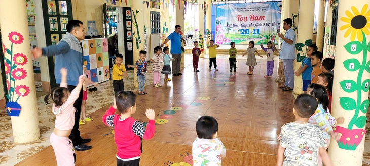 Các thầy giáo Trường mầm non Thành Sơn, huyện Bá Thước (Thanh Hóa) vui chơi cùng các bé – Ảnh: HÀ ĐỒNG