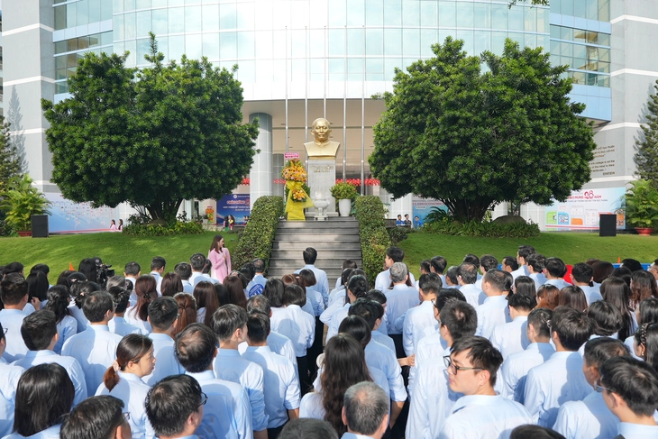 Cán bộ, nhân viên Trường đại học Tôn Đức Thắng thực hiện nghi lễ dâng hương trước tượng đài Chủ tịch Tôn Đức Thắng